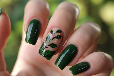 Close-up of hand with minimalist green nail polish and a delicate leaf accent on one finger