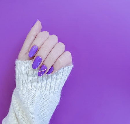 Stylish trendy purple female manicure. Young woman hands on the purple background, banner size