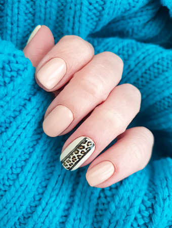Closeup elegant pastel natural modern design manicure on fabric silk background.