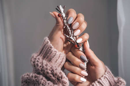 Women's hands with a beautiful matte oval manicure in a warm knitted sweater. Hands are holding a winter branch. Varnish beige nails with gel polish, shellac. Copy space.
