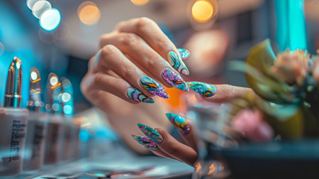 Vibrant Nail Art on Young Woman s Fingernails in a Modern Salon. Concept of Manicure, Creative Beauty, Fashion Trends, Personal Expression, and Acrylic Nails.