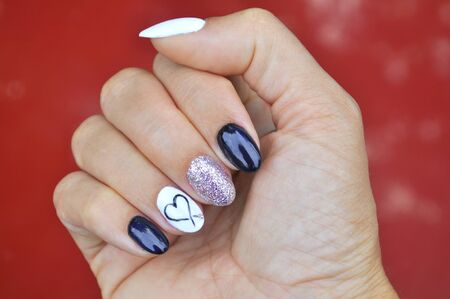 Manicure in black and white color with a heart on a nameless in a romantic style. Hand nails
