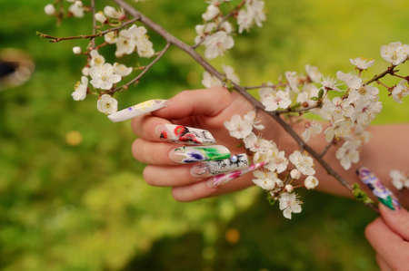 against the background of flowering branches of women s hands with a nice manicure different picture