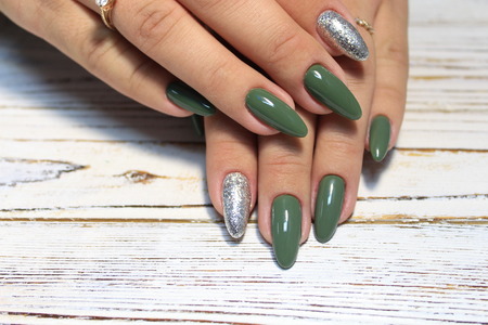 Female hand with long nails and a bottle of brown green nail polish