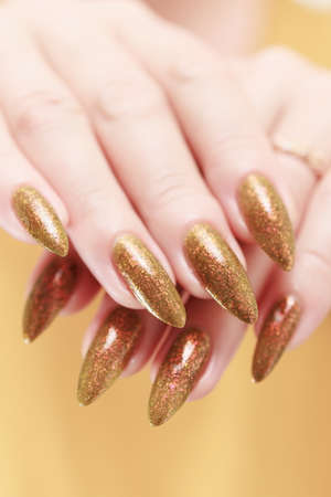 Female hand with trendy manicure. Nail design on a gold background closeup