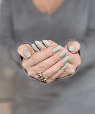 Female hand with long nails and gray green manicure with bottles of nail polish