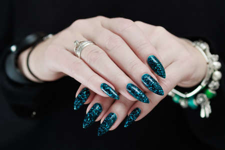 Woman's beautiful hand with long nails and turquoise green and blue manicure with bottles of nail polish