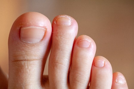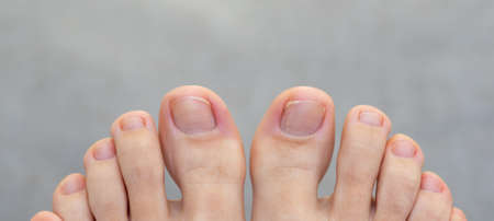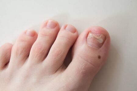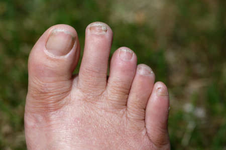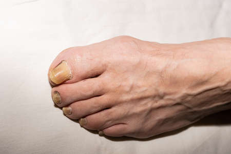 Closeup of a foot with damaged nails because of fungus. Dorsal, callus and corn feet infected by germs that cause nail dislocations.