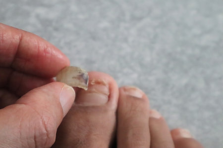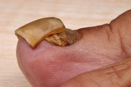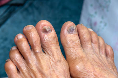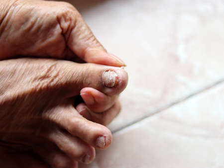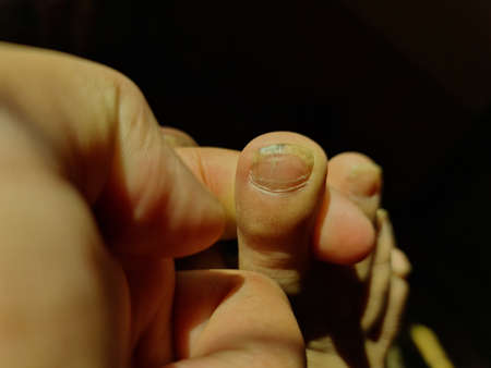 Toenails of men of retirement age are delaminated due to age, affected by fungus