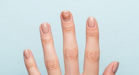 Close up of a woman hand with a broken and unhealthy fingernail on the index finger, highlighting nail damage and need for care.
