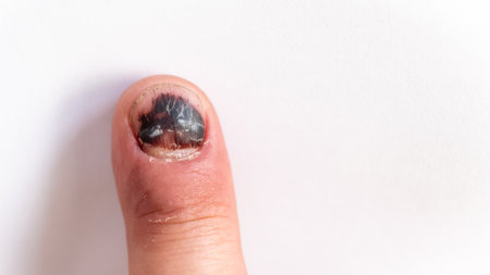 Thumb Finger with Bruised Nail, Subungual Hematoma, on White Background. Painful bruises, accident, injured fingers and medical concept. Close-up top view. Ugly concept. High