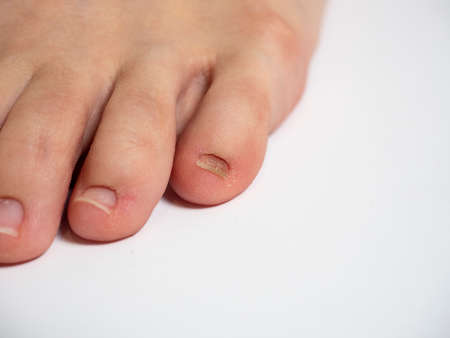 Close up image of left foot toe nail suffering from fungus infection. White background horizontal studio picture