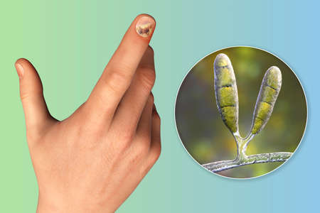 Human hand with onychomycosis and close-up view of Trichopyton mentagrophytes fungi, one of the causative agents of nail infections, 3D illustration