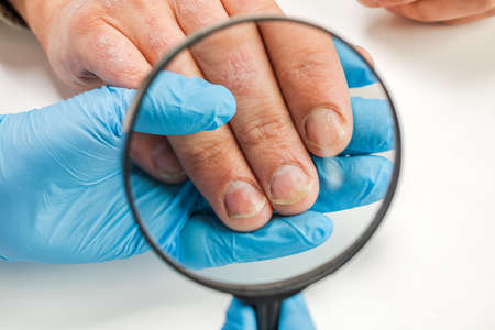 A dermatologist wearing gloves examines the skin of a sick patient. Examination and diagnosis of skin diseases-allergies, psoriasis, eczema, dermatitis.