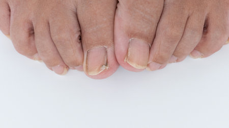 Close-up of human feet showing ingrown toenails against a pristine white background, emphasizing foot care and common health concerns