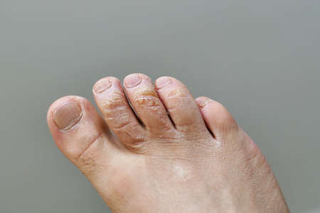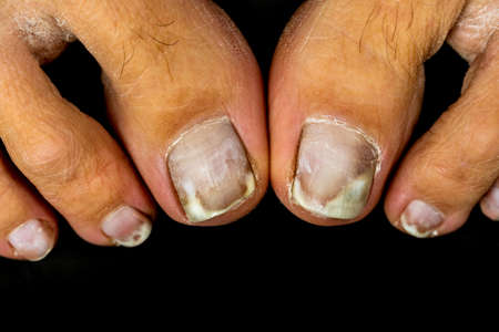 Fungal nail infection on male toe. Fungus on the toes of a diseased man leg. Foot Problems and Skin Diseases.