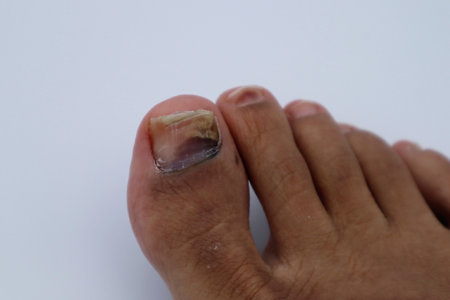 Close-up image of toenails showing signs of nail fungus disease, highlighting discoloration and texture, emphasizing the need for proper foot care