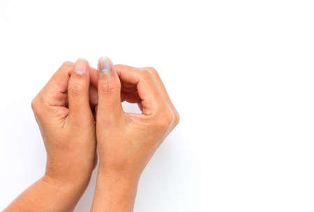 old woman hand compare right hand bleeding, bruising under a thumb nail that hurt by pressure from door,car door,falling things or ect.isolated on white background with copy space