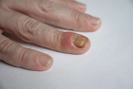 Inflamed cuticle on the finger. Damaged part of the finger, close-up.
