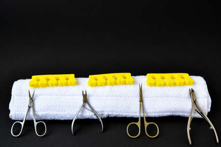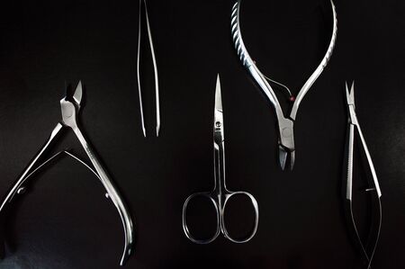 Set of professional tools for manicure master. Nail Cutter, Cuticle Pusher, Cuticle Nipper, Cuticle Scissors on black background with copy space for designer sign. Top view, macro, closeup.