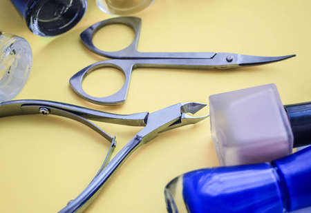 Set for nail care, manicure tools scissors, nippers, varnish on a yellow background