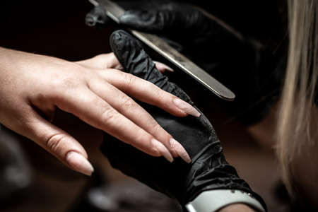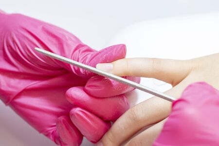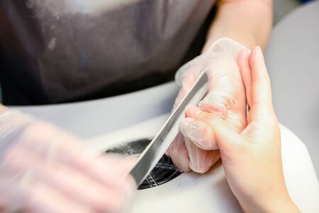 Closeup picture of manicure process on female hands in beauty nail salon. Manicurist nail file works.