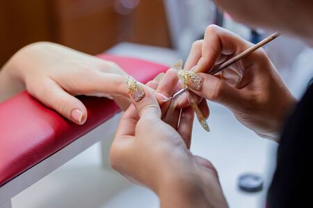 the process of doing manicure. Closeup of hands of professional manicurist, applying little stones on nails. Concept of doing manicure. beauty concept. Gel polish, shellac