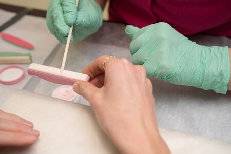 Manicure. Beauty saloon. Close-up. Remove old nail polish.