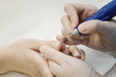 The manicurist processes the client's cuticle with a hardware machine. Hardware manicure.Cuticle removal using a machine with a cutter. Professional manicure in the salon close-up.
