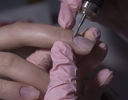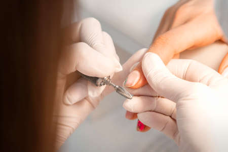 Closeup of manicure master removes nail polish uses an electric nail file in a nail salon