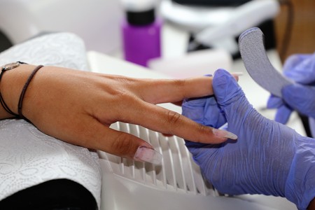 beauty and care. A girl with long nails in a beauty salon makes a correction at the manicure master. close-up. soft focus. concept.