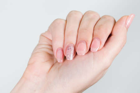 Closeup of 1 female white hand with old gel polished manicure need correction after several weeks wearing. Horizontal color photography.