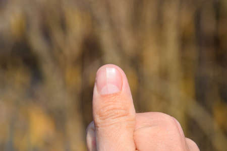 Forked nail on the thumb. Dilation of the nail, traumatic pathology. The nail is divided in half.