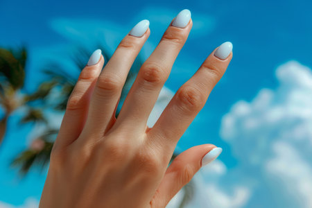 Female manicure of hands close-up against the sky , --ar 3:2 Job ID: b9c76129-a689-4482-9f5b-4055dc24d8a1