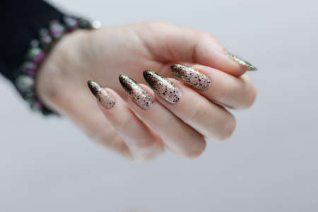 Female hand with trendy manicure. Nail design on a gold background closeup