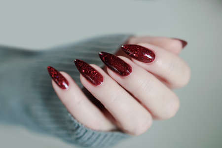 acrylic nail extension. Manicure. Nail correction. Hands in the foreground. copyspace.