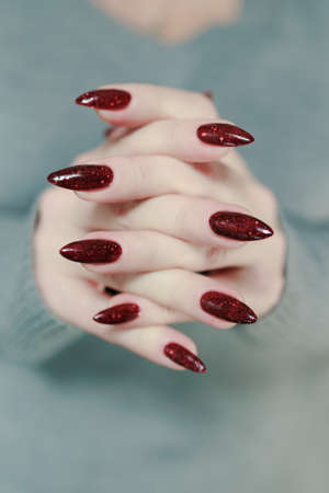 Stylish women's manicure in blue. Red background. Beautiful well-groomed hands, self-care. The concept of fashion and beauty industry. Space for text. Neat nail shape