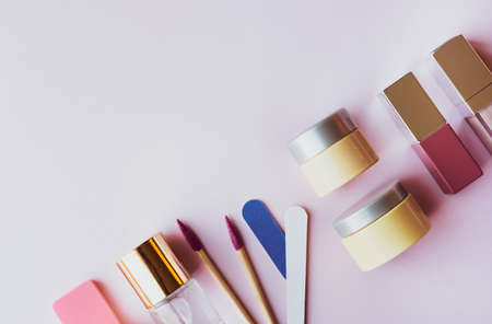 Assorted cosmetic products, moisturizer, cream, lipstick, nail files, lip gloss and sponges on pastel background. Beauty concept. Flat lay design.