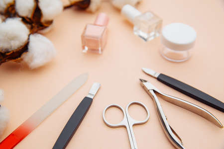 Woman hands, nail polish, manicure tools table top view flat lay. How to do manicure at home concept. Do manicure by yourself staying at home. Self care. Nude nails. Spa, medicine advertisement. Beauty.