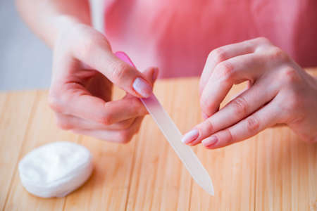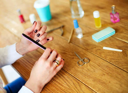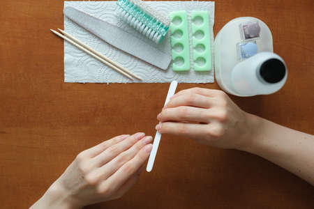Manicure at home. Women's hands sawing nails at home close up with a manicure set. View from above