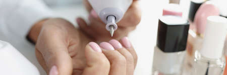 Manicurist makes hardware manicure close-up. Treatment of nails with the help of hardware manicure close-up