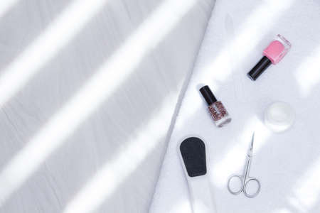 Flat lay product set of manicure and pedicure tools on white wooden background with sunlight. Nail beauty care concept.