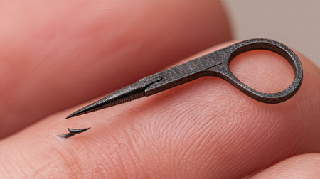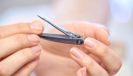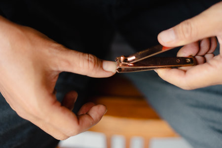 Close-up of a hand using nail clippers to cut a fingernail. This image shows the concept of personal care, hygiene, and daily routine. This is a common action for personal hygiene and nail grooming