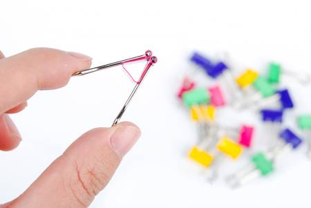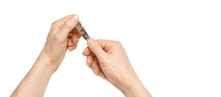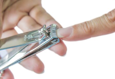 Man using nail clipper clipping her fingernails. white background