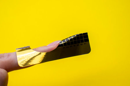 Beauty nail extensions. Bottom nail extensions. Paper forms for the clients nail extensions. Manicure. Nail on a yellow background