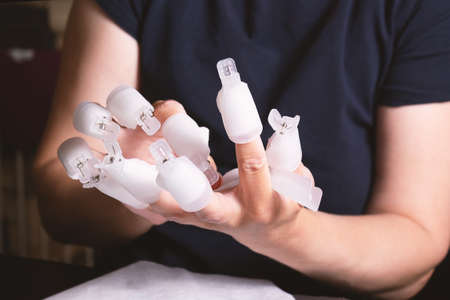 The procedure preparing varnish from nails. Plastic cover at nails