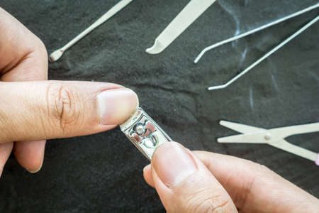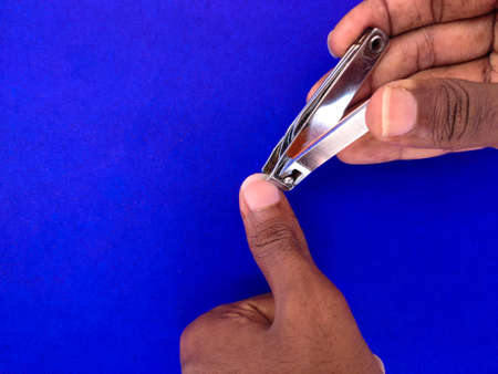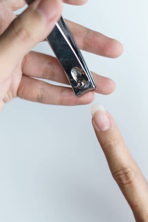 Males's hand holding on nail clippers, man use nail clipper cutting their thumbs nail.