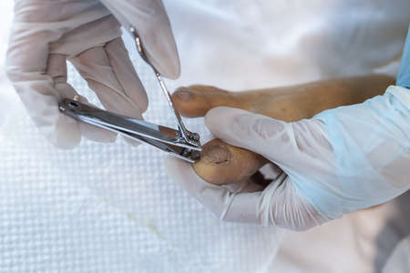 Close up,Hand of caregiver hold a nail clipper,cutting the ingrown nail for senior grandmother,asian nurse help to cut the toe nail for the old elderly at nursing home,pedicure,foot nail care,hygiene