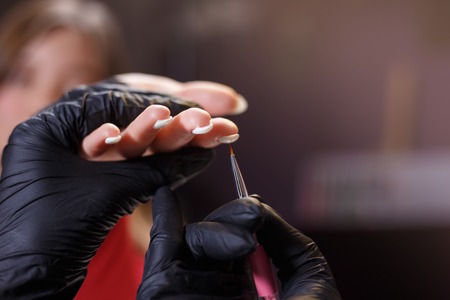 The master of nail extensions and coating with gel varnish makes correction to his client in the beauty salon