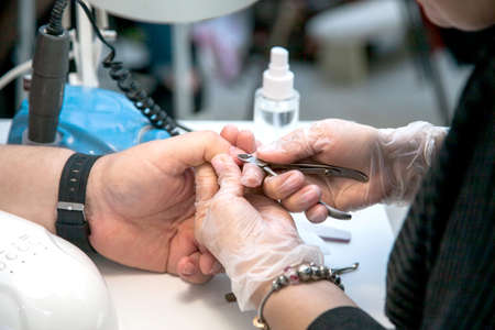 Men's manicure. A manicure master handles a man's nails with nail clippers in a beauty salon. Beauty industry.